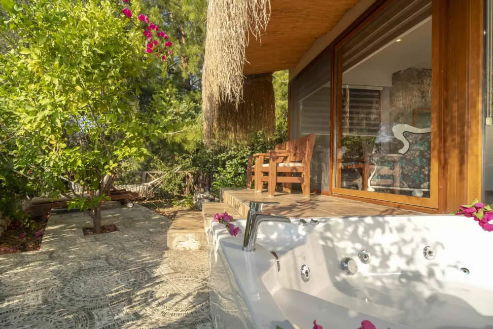 Özel bahçesi ve terasıyla huzurlu bir ortam sunar. Bahçede oturma grubu ve hamak yer alır.